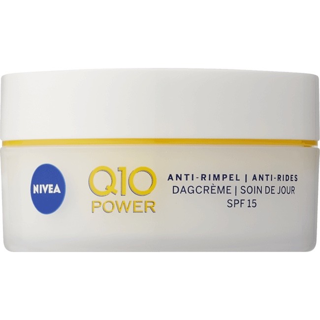 NIVEA Q10 Power Dagcrème SPF15 verhoogt, bij regelmatig gebruik, het natuurlijke Q10 en creatine gehalte in de huid. De formule bestrijdt de rimpels effectief van binnenuit en vermindert zichtbaar rimpels. SPF 15 en UVA helpen het ontstaan van nieuwe rimpels door invloeden van buitenaf te voorkomen. De verzorgende formule zorgt bovendien voor intensieve hydratatie.