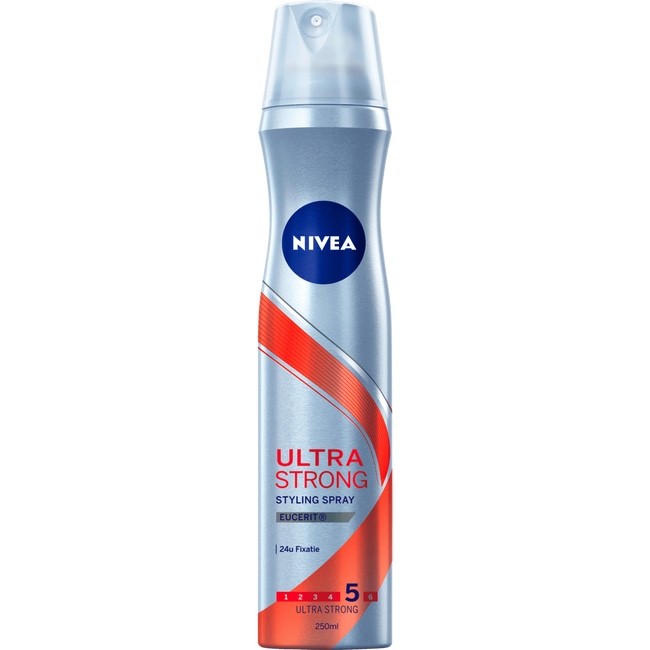 Nivea Ultra Strong Styling Spray met Hair Protection Factor – voor ultra sterke fixatie. Droogt je haar niet uit dankzij de verzorgende Macadamia-Olie. Versterkt & beschermt het haar. Voor mooi en zichtbaar gezond haar dat de hele dag goed zit.