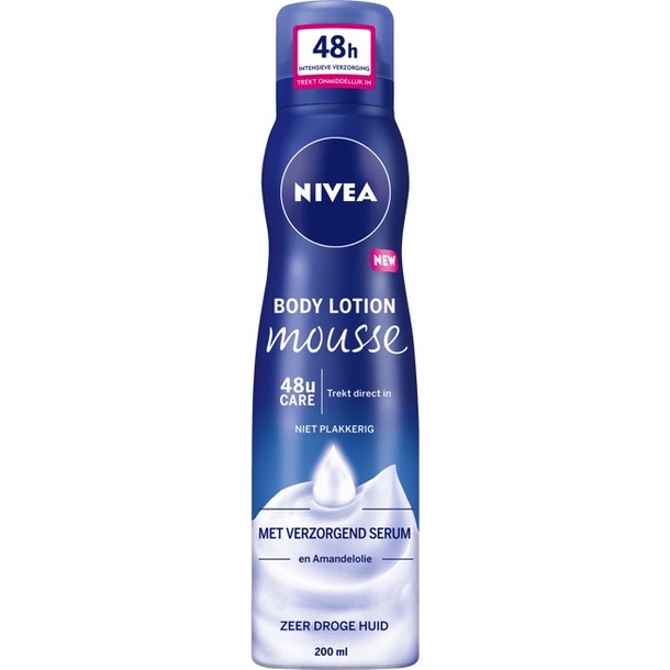 NIVEA Verzorgende Body Mousse is een romige bodylotion die de huid intensief verzorgd. De innovatieve formule is verrijkt met verzorgend serum en bevat verzorgende amandelolie. NIVEA Verzorgende Body Lotion Mousse trekt direct in en transformeert je droge huid in een voelbaar zachtere huid tot wel 48 uur lang.