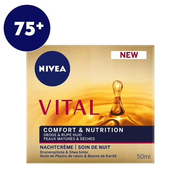Nivea Vital Comfort & Nutrition 75+ Nachtcrème is speciaal ontwikkeld voor de rijpe, droge huid. De formule voedt je huid intensief waardoor ze onmiddellijk comfortabel, zacht en soepel aanvoelt.