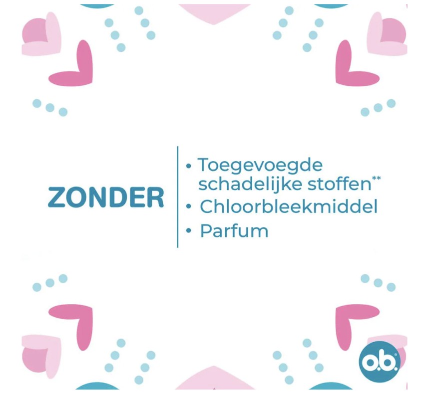 o.b.® Original Normal tampons met gebogen groeven leiden de vloeistof efficiënt naar de kern van de tampon. De StayDry-technologie zorgt voor een droog koordje en een fris en schoon gevoel. o.b.® Original Normal tampons zijn ideaal voor de gemiddelde tot zware dagen van uw menstruatie. De tampons zijn gynaecologisch getest, hebben een kern die 100% plantaardig is, zonder schadelijke chemische stoffen (o.a. pesticiden). o.b.® Original Normal tampons zijn chloor- en parfumvrij.
