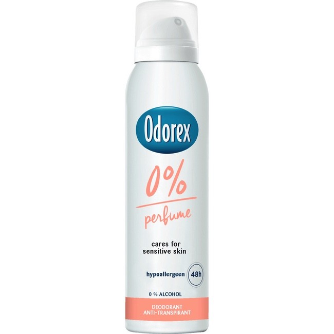 Odorex 0% Perfume Deodorant Spray heeft een vriendelijke, neutrale geur en is 48 uur effectief tegen transpiratie. De deodorant is vrij van alcohol en parfum en is hierdoor geschikt voor de gevoelige huid.