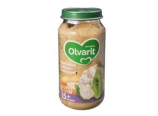 Olvarit 15m08 Bloemkool Kalkoen Aardappel is speciaal gemaakt voor kindjes vanaf 15 maanden. De babyvoedingheeft de herkenbare smaak van bloemkool. Door uw kindje al vroeg kennis te laten maken met de pure smaak van groente, helpt dit de smaak te herkennen en te waarderen. De smaak en textuur van Olvarit babyvoeding zijn aangepast op de leeftijd van uw kindje, om een goede smaakontwikkeling te ondersteunen.