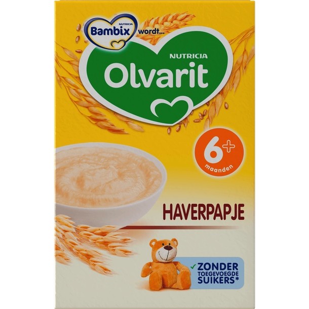 Olvarit Haverpapje 6+ Maanden zit boordevol pure granen die je kindje de benodigde voedingsstoffen en energie bieden om de dag goed te beginnen! Omdat je kleintje snel blijft groeien, zich volop ontwikkelt en meer energie nodig heeft, wordt het ontbijt van je kindje na zes maanden steeds belangrijker. Het Olvarit Haverpapje bevat meer vezels dan de Olvarit 4+ pappen, maar is wel nog heel fijn van structuur. Deze pap sluit daarom perfect aan bij de voedingsbehoefte van je kindje op deze leeftijd.