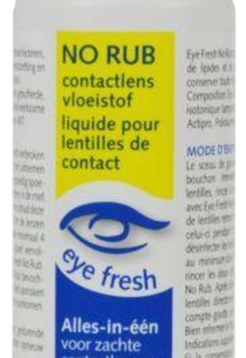 Eye Fresh No Rub is geschikt voor het desinfecteren, inzetten, bewaren en reinigen van eiwitafzetting en vertaalslag van alle zachte contactlenzen.