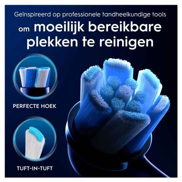 • Op de kenmerkende ronde borstelkop van Oral-B zijn de borstelharen zorgvuldig geplaatst om elke tand zo goed mogelijk te omvatten voor de best mogelijke reiniging