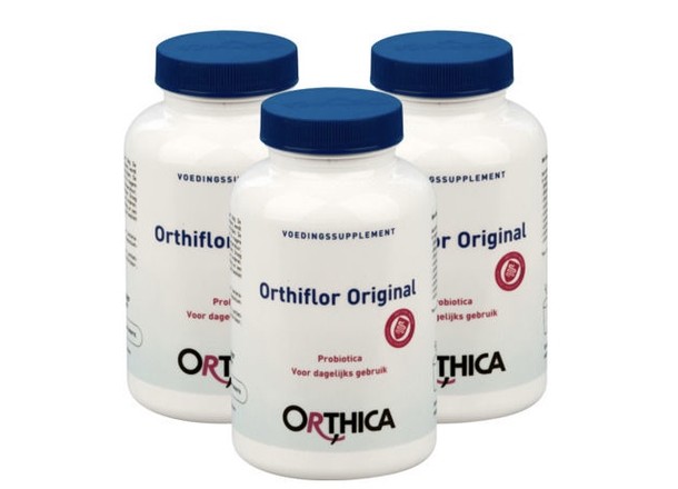 Eén capsule Orthica Orthiflor Original bevat: 1 x 109 kve* van de volgende bacteriën in ongeveer gelijke verhoudingen: Lactobacillus acidophilus Lactobacillus salivarius Lactobacillus paracasei Lactococcus lactis Bifidobacterium bifidum Bifidobacterium lactis Enterococcus faecium *kve = kolonievormende eenheden Gebruik 1-3 capsules per dag, met ruim water innemen op een lege maag. Voor een optimaal effect de inhoud van de capsule(s) in een half glas lauw water oplossen. Minimaal 15 minuten laten staan, doorroeren en opdrinken. Kinderen vanaf vier tot twaalf jaar 1 capsule per dag. Ingrediënten maïszetmeel, gelatine, maltodextrine, kaliumchloride, bacteriecultuur, magnesiumsulfaat, enzymen, mangaansulfaat. Vrij van sacharose, gluten, niet natuurlijke conserveermiddelen en synthetische kleur-, geur- en smaakstoffen. Dit product is een voedingssupplement. Aanbevolen dosering niet overschrijden. Een gevarieerde, evenwichtige voeding en een gezonde levensstijl zijn belangrijk. Een voedingssupplement is geen vervanging van een gevarieerde voeding. Buiten bereik van jonge kinderen houden. Droog, afgesloten en bij kamertemperatuur bewaren, tenzij anders geadviseerd op het etiket. Raadpleeg een deskundige alvorens supplementen te gebruiken in geval van zwangerschap, lactatie, medicijngebruik en ziekte. "