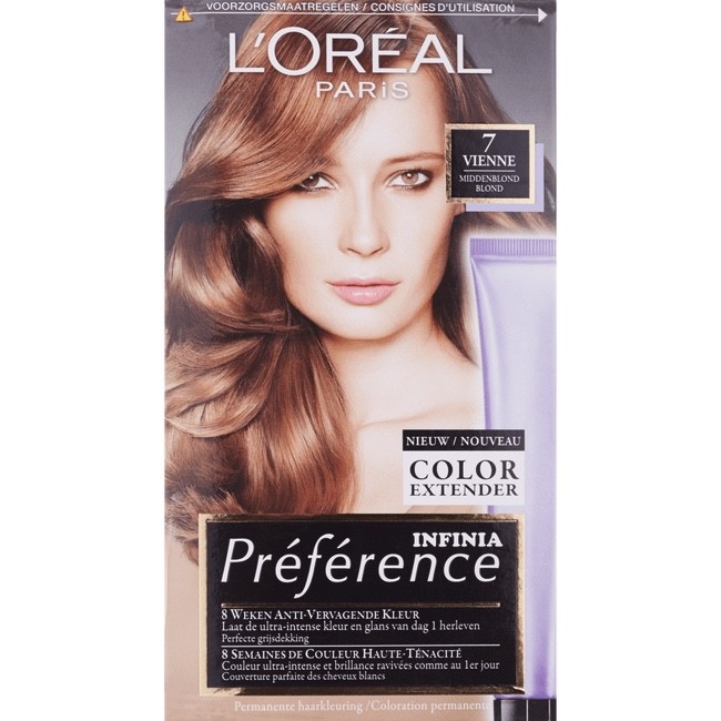 L'Oréal Paris Préférence Permanente Haarkleuring 7 Vienne is een permanente haarkleuring voor een krachtige kleur en perfecte grijsdekking. De verpakking bevat een kleur vasthoudende verzorging die zorgt voor zijdezacht en glanzend haar, dankzij het UV-filter en de vitamine E. De bijgevoegde Color Extender zorgt voor een extra lang kleurresultaat. L'Oréal Paris Préférence Permanente Haarkleuring zorgt voor een intense en trendy haarkleur met een glans die wekenlang zichtbaar blijft.