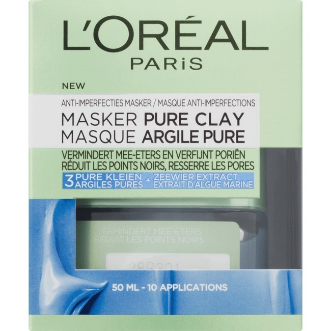 L'Oréal Paris Pure Clay Anti-Imperfecties Masker vermindert mee-eters en puistjes. L'Oréal Paris heeft drie pure kleien geselecteerd en gecombineerd met de zuiverende eigenschappen van zeewier-extract. Het resultaat is het Pure Clay Masker Anti-Imperfecties, een kleimasker dat mee-eters en puistjes vermindert en de huid fris en comfortabel laat aanvoelen. Het kleimasker heeft een zachte, masker-crème textuur die de huid niet uitdroogt. Bij regelmatig gebruik van het Pure Clay Masker Anti-Imperfecties zijn de poriën zichtbaar verkleind en de huid lijkt gezonder.