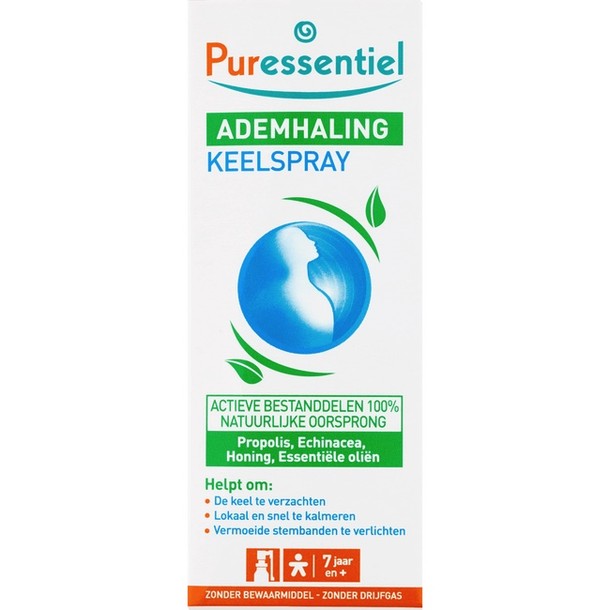Puressentiel Ademhaling Keelspray is een 100% natuurlijke spray die zones in de keel, zoals de keelholte en stembanden kalmeert. Deze spray wordt ook aanbevolen aan mensen die stemproblemen hebben en is vrij van conserveringsmiddelen, drijfgas, kleurstoffen en kunstmatige geurstoffen. De spray is verrijkt met: - munt, vanwege het helend, antiseptisch en slijmoplossend vermogen; - thujanol-tijmetherische olie, vanwege het stimuleren van immuunsysteem en gaat infecties tegen.