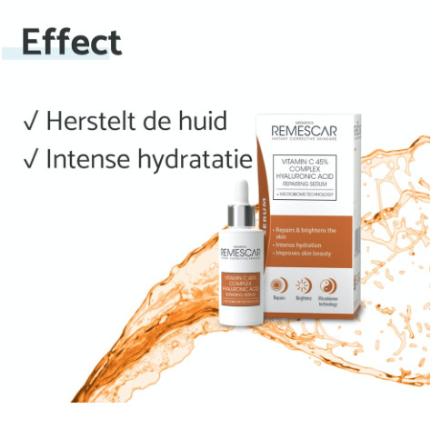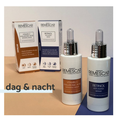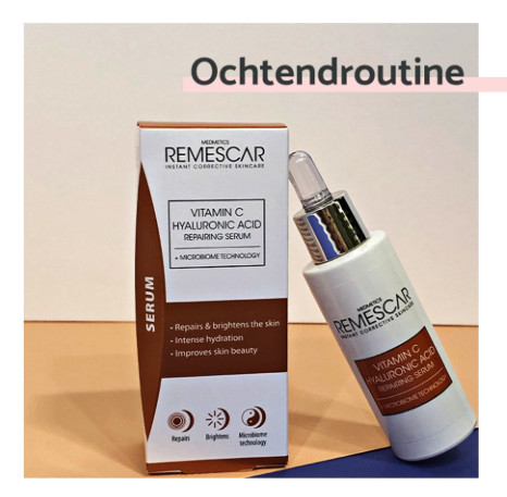 Remescar Herstellend Serum met Vitamine C en Hyaluronzuur is onmisbaar in je ochtendritueel. Het zorgt voor een goede hydratatie en herstelt de huid. Om de visuele tekenen van veroudering nog beter aan te pakken is het aangeraden om dit serum te combineren met Remescar Retinol Serum dat 's avonds wordt aangebracht. Daarenboven kan u instant rimpels verminderen met Remescar Instant Rimpel Corrector.