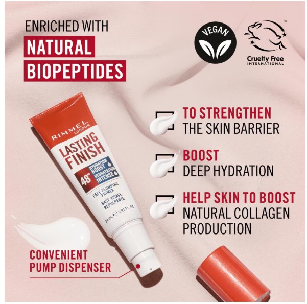 Rimmel Lasting Finish Primer is een vegan primer die de huid 48 uur lang hydrateert en voller laat lijken.