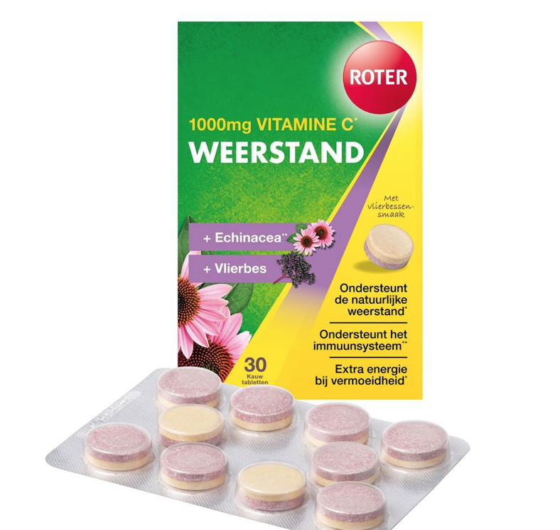 Roter Vitamine C Weerstand is een lekkere kauwtablet met een hoge dosering vitamine C, echinacea en vlierbes. Vitamine C kan je lichaam niet zelf aanmaken. Je moet deze vitamine via voeding binnenkrijgen. Vitamine C zit onder andere in groenten, fruit en aardappelen. De ene keer krijg je wel genoeg vitamine C binnen, maar dat lukt niet altijd en op sommige momenten heeft je lichaam ook behoefte aan meer vitamine C.