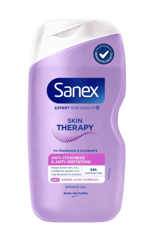 - Sanex Skin Therapy is speciaalgeformuleerd voor huid die atopischgevoelig is voor eczeem envermindert irritatie na slechts 3 dagengebruik. doucheoil