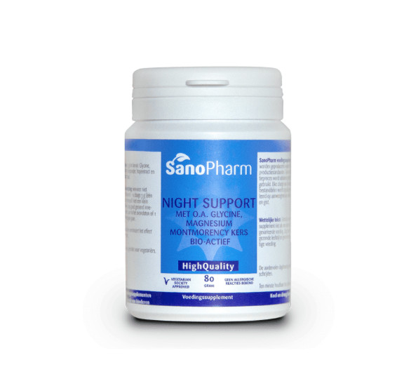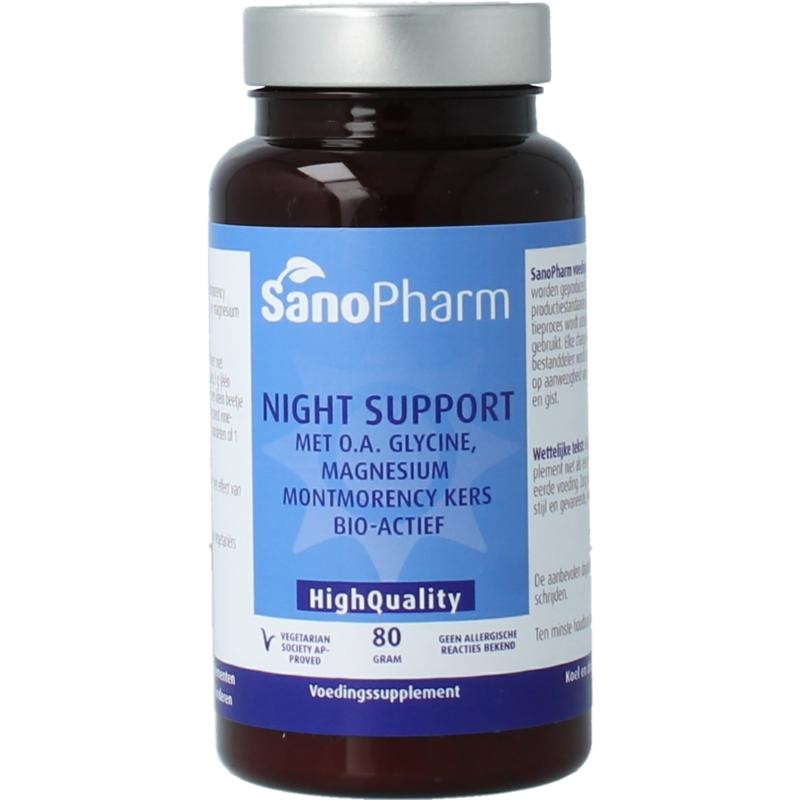 Productinformatie van SanoPharm Night Support: Toepassing van SanoPharm Night Support: Night met onder andere glycine, magnesium, montmorency kers. Bio-actieve formule.Night Support is speciaal ontwikkeld voor personen die moeite hebben om 's nachts in slaap te vallen, last hebben van slapeloosheid of andere slaapstoornissen hebben.