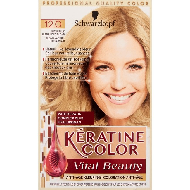 Schwarzkopf Kératine Color Vital Beauty Anti-Age Kleuring 12.0 Ultra Licht Natuurlijk Blond is een permanente 3 Stappen ‘Care-Color’ kleuring voor veeleisend haar. De kleuring biedt een stralend en harmonieus kleurresultaat voor een natuurlijke uitstraling met 100% grijsdekking. De formule met keratine complex plus en hyaluronan is ontwikkeld om beschadigingen tegen te gaan en te verzorgen voor, tijdens en na het kleuren, voor een verminderde haarbreuk tot 80%.