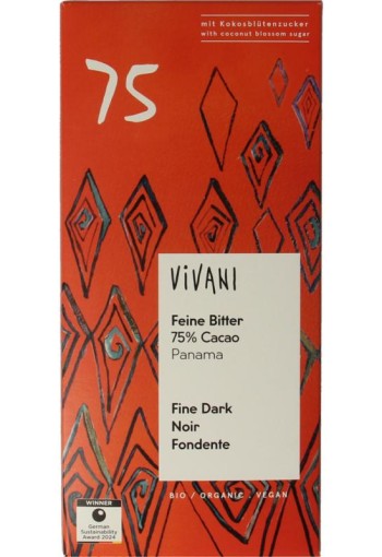 Vivani Chocolade puur 75% kokosbloesemsuiker bio (80 Gram) Vivani Panama 75% cacao pure chocolade met kokosbloesem suiker. € 3,95 € 3,55 BEKIJKEN