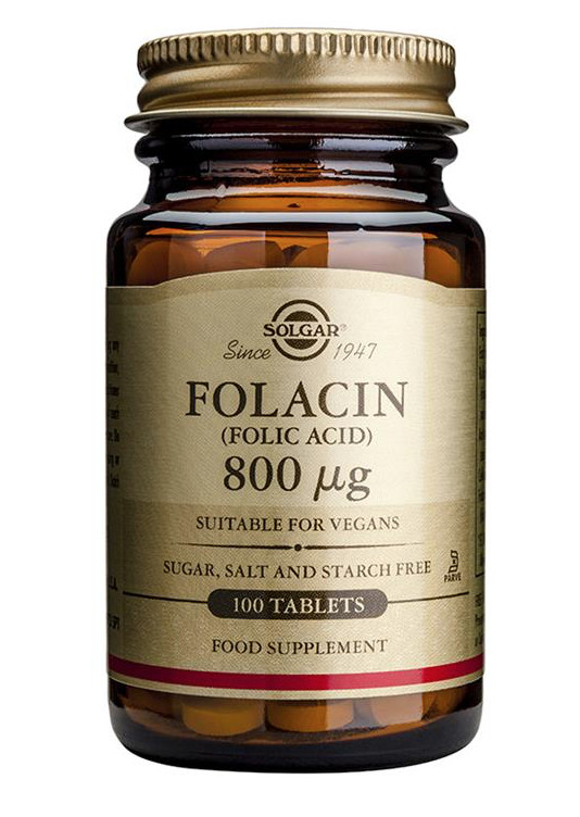 Solgar Folacin 800 µg (foliumzuur, vitamine B-9, vitamine Bc, vitamine B-11) speelt een rol bij de vorming van rode bloedcellen, de bloedopbouw en de omzetting van vitamine B-12. Foliumzuur is een methyldonor en helpt daardoor bij het verlagen van het homocysteïne gehalte in het bloed. Zwangeren en vrouwen met een kinderwens wordt extra inname aanbevolen ter bevordering van een goede ontwikkeling van het zenuwstelsel van het ongeboren kind.