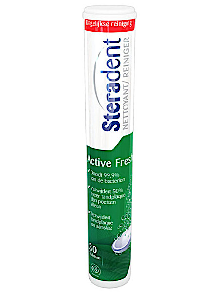 Steradent Active Fresh reinigt uw kunstgebit grondig en zorgt daarnaast voor extra frisheid. Steradent Active Fresh maakt biedt het beste resultaat bij tweemaal daags gebruik.