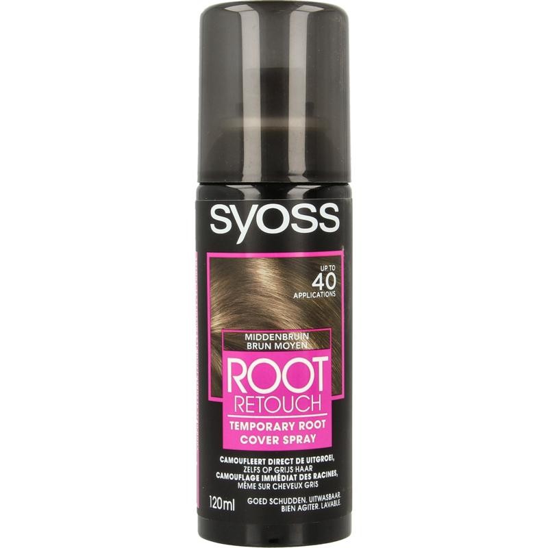 Syoss Uitgroeispray Middenbruin camoufleert tijdelijk uitgroei tot 25 toepassingen in slechts enkele seconden dankzij de minerale kleurpigmenten. Deze nuance is geschikt voor alle lichtbruine tot donkerbruine kleuren en houdt tot 1 wasbeurt. De spray droogt onmiddellijk en maakt het wegwerken van de uitgroei snel en gemakkelijk!