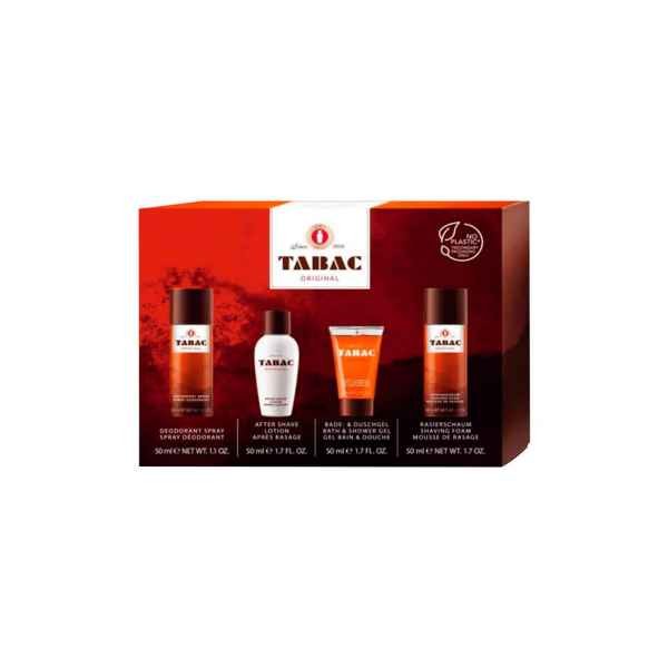 De TABAC ORIGINAL geurset bevat de After Shave Lotion (50 ml), de Bath & Shower Gel 50 ml, de Deodorant Spray 50 ml en de Luxury Soap 50 g.