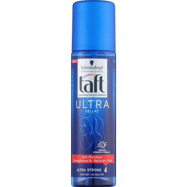 Schwarzkopf Taft Ultra Gellac Ultra Strong level 4 is de perfecte combinatie tussen de kracht van een gel en de precisie van een spray. Schwarzkopf Taft Ultra Gellac Ultra Strong level geeft 24 uur lang ultra sterke versteviging aan je haar.