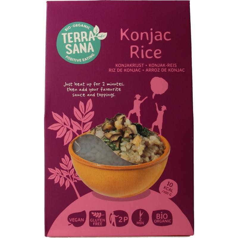 Konjac (ook wel konjak genoemd) is een plant waarvan de wortel (vezel) gebruikt wordt om ‘rijst’ te maken. Konjacrijst is dus een vervanger voor rijst, maar dan low-carb, low-calorie en glutenvrij. Ideaal als je vandaag even geen koolhydraten wilt eten, of als je al aan je calorieën zit voor vandaag. De vorm lijkt op rijst, waardoor je het gevoel hebt dat je rijst eet. De smaak en structuur is echt anders. Dat kan ook niet anders met een product dat zo erg op rijst lijkt, maar toch zo verschilt in voedingswaarde. Het grote voordeel aan de konjac rijst van TerraSana? Er zit geen vieze visgeur aan, dus je hoeft de rijst niet vooraf om te spoelen. Ready to eat, of ready to heat. Ga je de konjacrijst verwarmen, dan ben je in 2 minuten klaar. Een gemaksproduct dat alles in huis heeft!