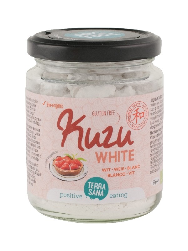 Kuzu is een plantaardig, effectief bindmiddel dat wordt gemaakt van het zetmeel van de kuzuplant. Het wordt in Japan veel gebruikt voor soepen, sauzen en (warme) desserts. Het fijne aan kuzu is dat het de smaak in een gerecht niet aantast. In tegenstelling tot maïzena is kuzu ook goed te gebruiken in zure gerechten. Bovendien is het glutenvrij én veganistisch! Witte kuzu wordt gewassen en gefilterd, waardoor de smaak neutraal en de bindkrachtig iets krachtiger is dan van grijze kuzu.