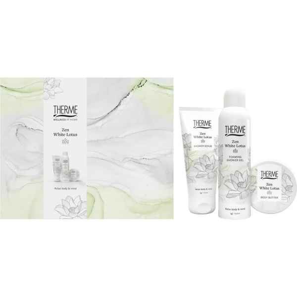 Therme Zen White Lotus Shower Scrub is een milde lichaamsscrub, met natuurlijke scrubdeeltjes, voor onder de douche. Het verwijdert dode huidcellen en helpt de celvernieuwing te stimuleren. Scrub je huid zijdezacht en geniet van een ultiem wellness moment. Therme Zen White Lotus Body Butter is een rijk voedende crème die de huid intensief hydrateert. Het laat een verzorgend laagje achter en parfumeert het lichaam langdurig met de serene geur. Therme Zen White Lotus Foaming Shower Gel is een heerlijke douchegel die transformeert naar een rijk schuim wanneer het in aanraking komt met de huid. Maak van je dagelijkse douche moment een luxe wellness ervaring en geniet van het weldadige schuim.