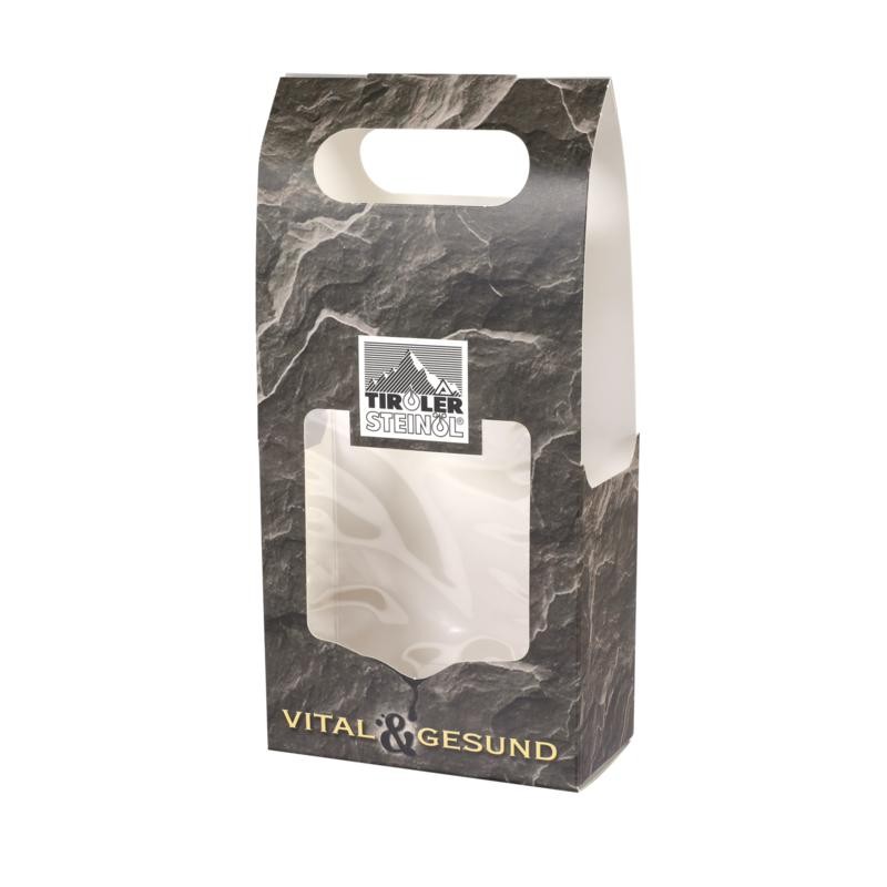 Een bijzonder cadeau-idee: de nieuwe draagtas "Tiroler Steinöl" voor losse artikelen. Het meest geschikt om 2 producten in maat 200ml te combineren.