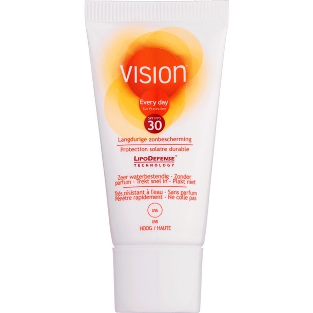 Vision Every Day Langdurige Zonbescherming Tube SPF30 15 ml beschermt langdurig tegen de schadelijke UVA- & UVB-stralen van de zon. Vision Every Day Langdurige Zonbescherming Tube SPF30 is 100% parfumvrij en trekt zeer snel in, waardoor de huid niet vet en plakkerig aanvoelt. Mede door de liposomen biedt de Vision Every Day Langdurige Zonbescherming Tube SPF30 langdurige zonbescherming die ook nog zeer waterbestendig is.