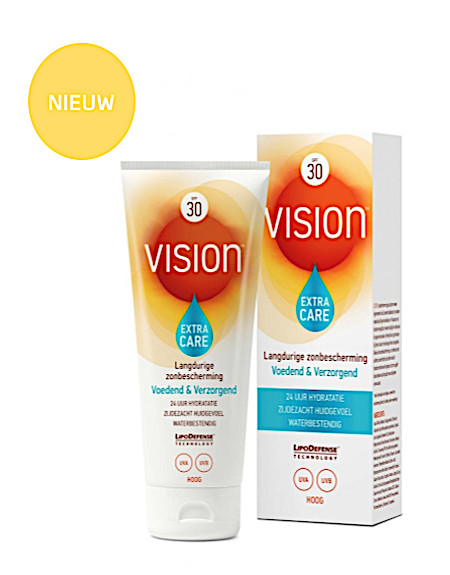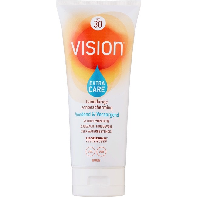 Vision Extra Care SPF30, met de unieke LipoDefenseTM Technology, biedt naast langdurige zonbescherming tegen de schadelijke UVA- en UVB-straling, intensieve verzorging van de huid. Vision Extra Care bevat een Nutriboost Complex met o.a. vitamine E, C en Shea Butter, die extra voeding geeft aan de huid om nadelige effecten van de zon tegen te gaan: Deze formulering helpt o.a. vroegtijdige huidveroudering door de zon te voorkomen De speciale formule met een actief 24 uurs hydraterend complex zorgt voor een mooie gehydrateerde huid die zijdezacht aanvoelt. Zeer geschikt voor de gevoelige huid, bevat geen parfum en is dermatologisch getest.