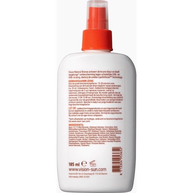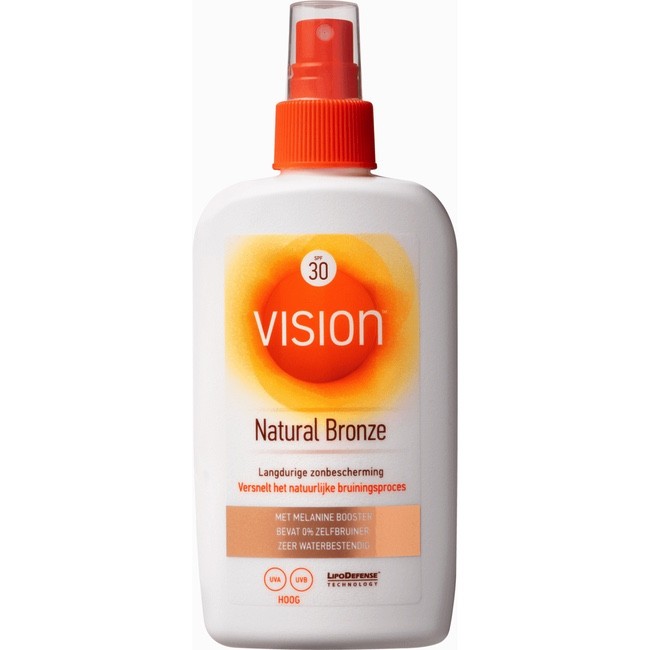Vision Natural Bronze SPF 30 activeert de bruine kleur en biedt langdurige zonbescherming tegen schadelijke UVA- en UVB-straling. Vision Natural Bronze versnelt het natuurlijke bruiningsproces, dankzij de Melanine Booster. Het bevat geen zelfbruiner.