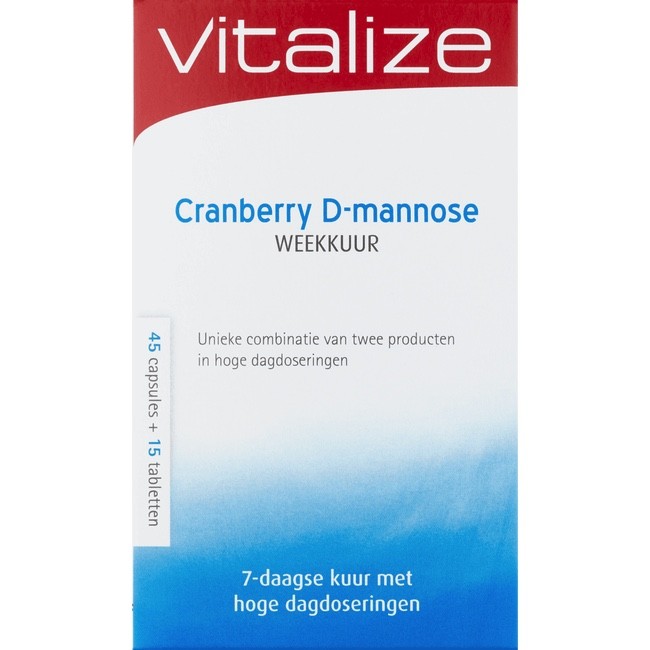 Vitalize Cranberry D-Mannose Weekkuur Capsules bevatten voedingssupplement waarin twee Vitalize producten zijn gecombineerd. Deze combinatie maakt het een krachtige weekkuur! Deze weekkuur is zonder problemen te gebruiken door diabetici. De weekkuur bevat Vitamine C, en heeft een gunstige invloed op de vermindering van vermoeidheid en moeheid. Een handige innamekaart is inbegrepen.