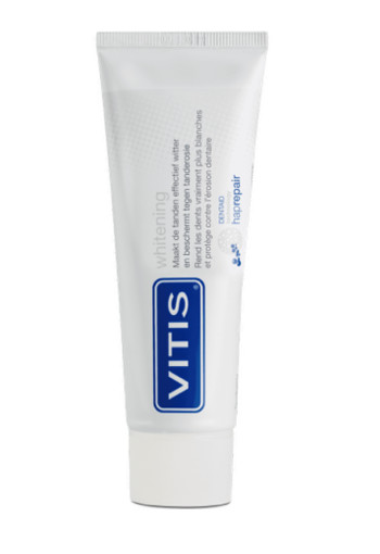 Witte tanden zijn niet langer een droom want de Vitis Whitening herstelt het tandoppervlak en maakt deze weer natuurlijk wit. De tandpasta bevat nanodeeltjes die zich hechten aan het tandoppervlak. Dankzij Vitis Whitening tandpasta en mondwater krijg je zichtbaar wittere tanden.