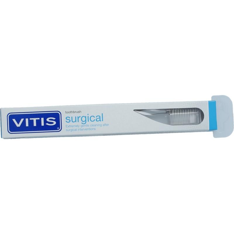 Prachtige tandenborstel met zeer zachte Tynex borstelharen van DuPont. Speciaal bedoeld voor het tandenpoetsen na mondchirurgische ingrepen (zoals na kaakchirurgie en tandvleesoperaties). Een unieke eigenschap van de Vitis Surgical tandenborstel is dat de steel naar eigen wens kan worden voorgebogen zodat ook lastige plaatsen goed bereikbaar zijn. Voorzien van een handig en hygiënisch beschermkapje.