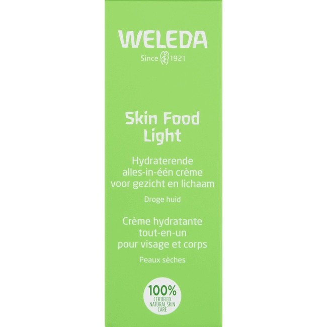 Skin Food Light is een welkome dorstlesser voor de droge huid. Ze biedt namelijk onmiddellijke hydratatie en comfort door haar lichte, snel intrekkende formule. Het geheim van deze crème is de combinatie van biologische zonnebloemolie met o.a. driekleurig viooltje, kamille en calendula. Zij hydrateert de huid langdurig en herstelt de barrièrefunctie. Ideaal om altijd bij de hand te hebben voor droge en ruwe plekken op gezicht en lichaam.