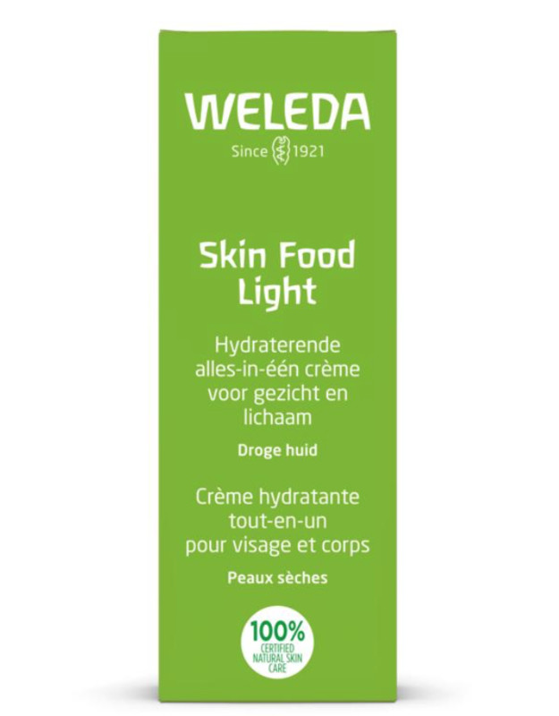 Skin Food Light is een welkome dorstlesser voor de droge huid. Ze biedt namelijk onmiddellijke hydratatie en comfort door haar lichte, snel intrekkende formule. Het geheim van deze crème is de combinatie van biologische zonnebloemolie met o.a. driekleurig viooltje, kamille en calendula. Zij hydrateert de huid langdurig en herstelt de barrièrefunctie. Ideaal om altijd bij de hand te hebben voor droge en ruwe plekken op gezicht en lichaam.