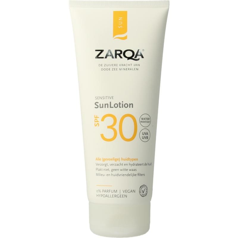 ZARQA SunLotion SPF30 - met huid- en milieuvriendelijke UVA/UVB filters - is zonbescherming met hoge spf voor intensieve bescherming van zelfs de meest gevoelige huid. De parfumvrije en waterbestendige formule smeert prettig, trekt snel in, plakt niet en laat geen witte waas achter. De verzorgende lotion beschermt de huidbarrière tegen uitdroging en is verrijkt met glycerine en shea butter voor langdurige hydratatie. Het krachtige anti-oxidant vitamine E beschermt de huid tegen schade door vrije radicalen. <br>De lotion is zo mild dat deze gebruikt kan worden bij een zon- en allergie- gevoelige huid, en helpen bij het kalmeren van een geïriteerde huid. Voor het hele gezin.